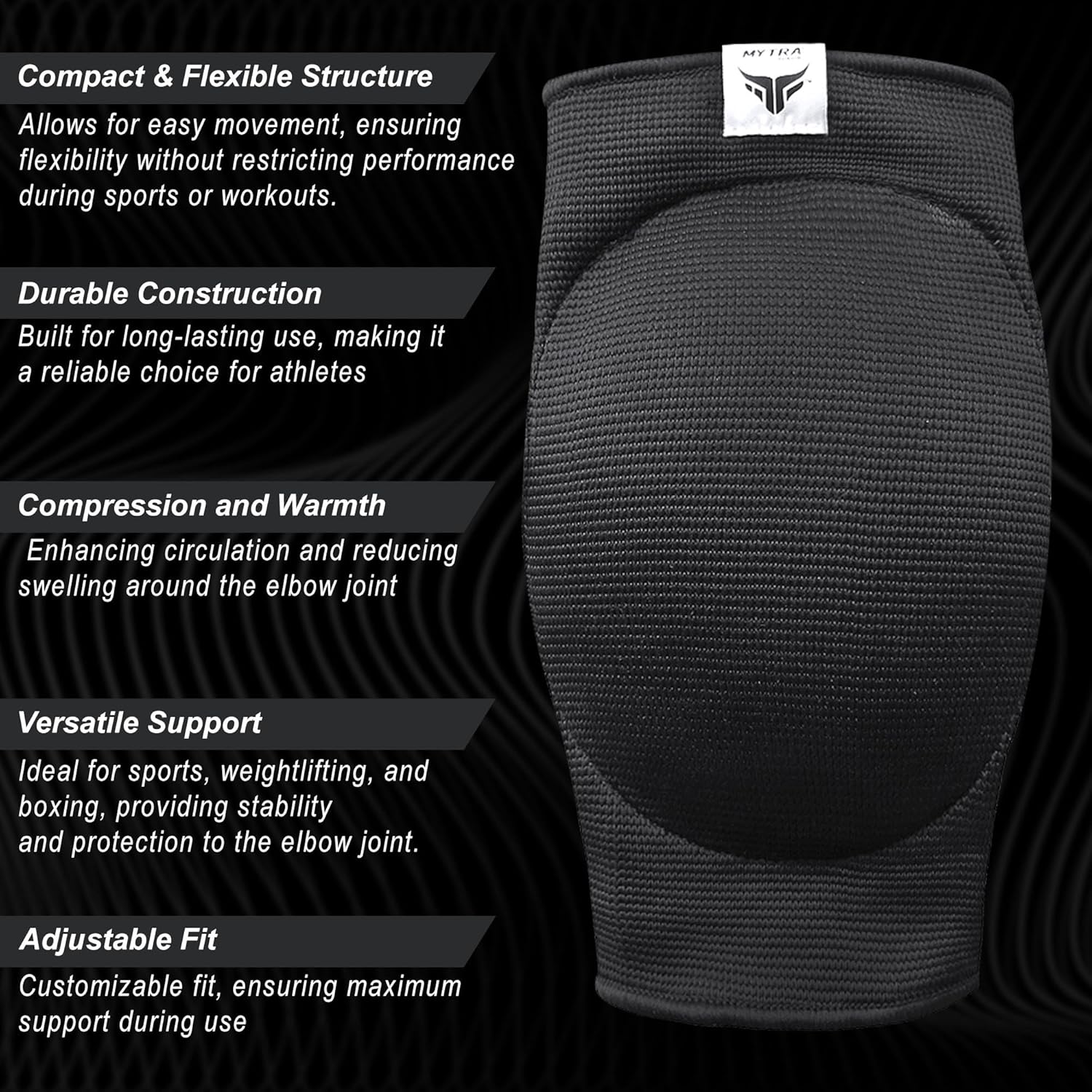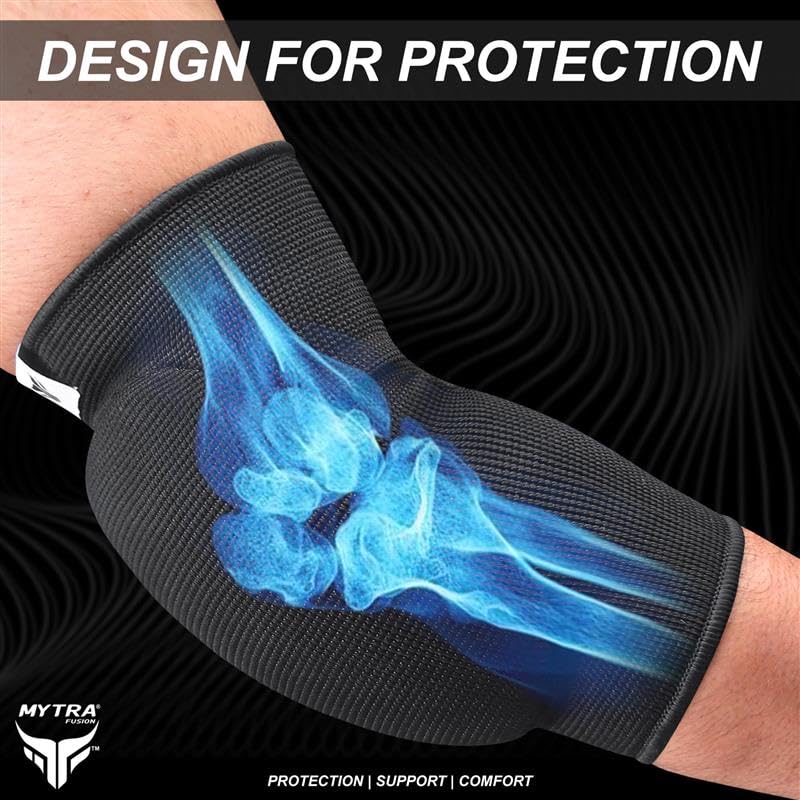 • ✔️ SECURE, NON-SLIP PERFORMANCE — Mytra Fusion gym elbow support features a convenient slip-on design made with high-stretch fabric and secure, non-slip cuffs. This design ensures a snug, contoured fit that stays firmly in place during intense activities, from lifting weights to diving for a ball.