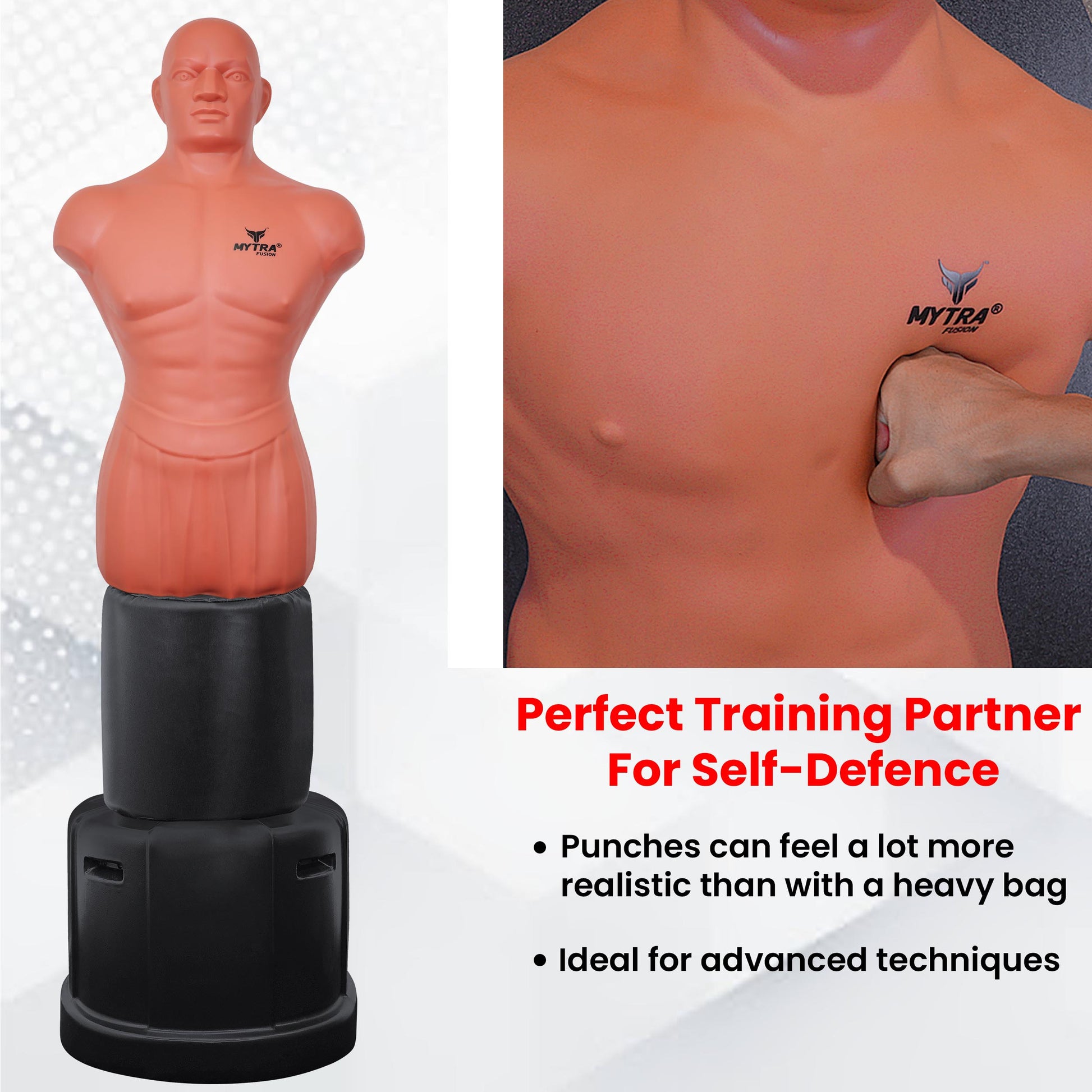 Le mannequin Mytra Fusion Bob XL est l'outil d'entraînement ultime pour la précision, la force et l'autodéfense. Fabriqué en plastisol et mousse d'uréthane de haute qualité, il résiste aux coups de poing et aux coups de pied intenses. Son design réaliste, avec son torse en abdos, offre un entraînement ciblé au grappling, aux frappes et à l'étranglement.