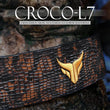 Disponible en quatre tailles (S, M, L, XL) et un design unique en peau de crocodile marron foncé.